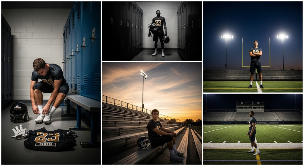 Another creative idea is taking pictures under stadium lights at night it adds drama and intensity that matches the spirit of the sport. Seniors can also include their gear, like shoulder pads or cleats, for close up detail shots.