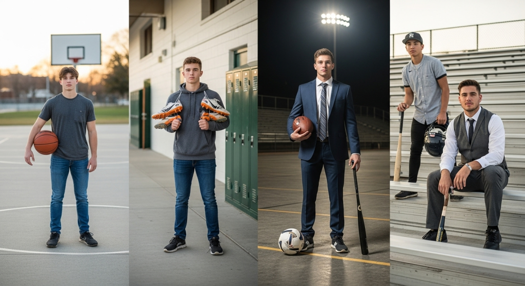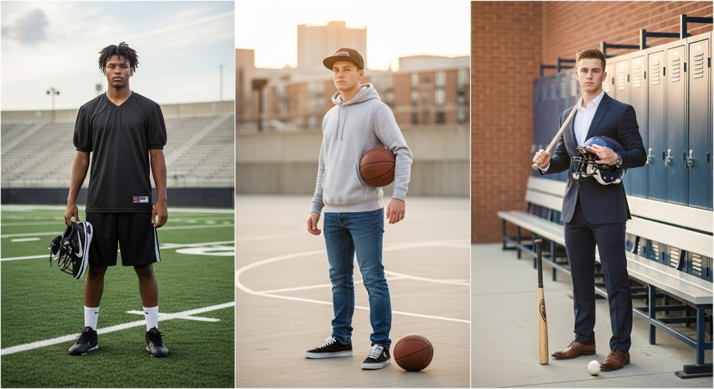 Outfits play a huge role in senior portraits because they help tell the story of who the senior is, both on and off the field. For guys who want sports-themed pictures, choosing the right outfit makes the difference between a good photo and a memorable one. Whether it’s wearing a team jersey, casual streetwear mixed with sports gear, or even a formal outfit with a sporty twist, clothing helps showcase personality and achievements.