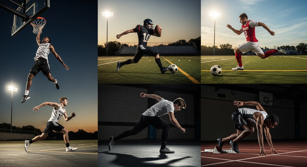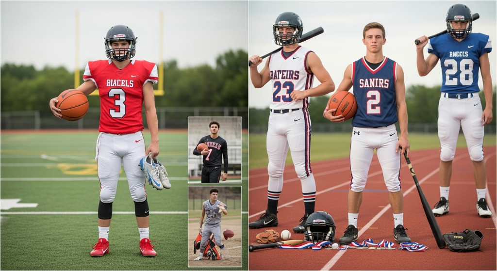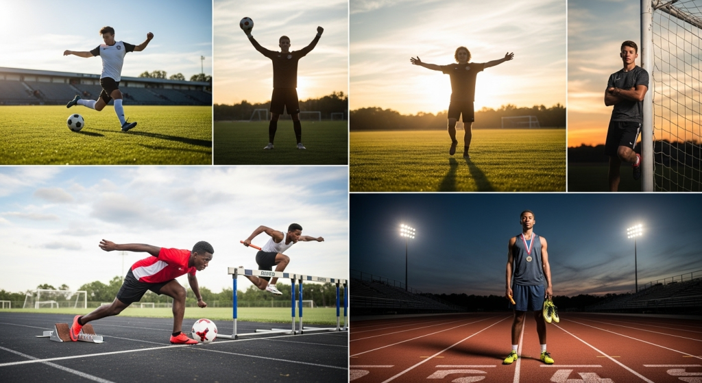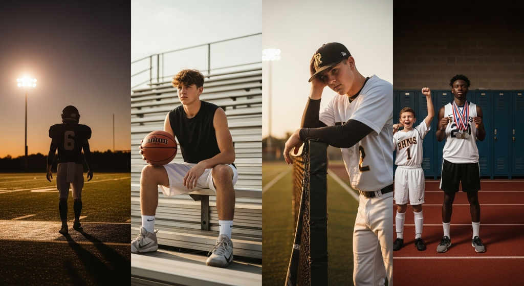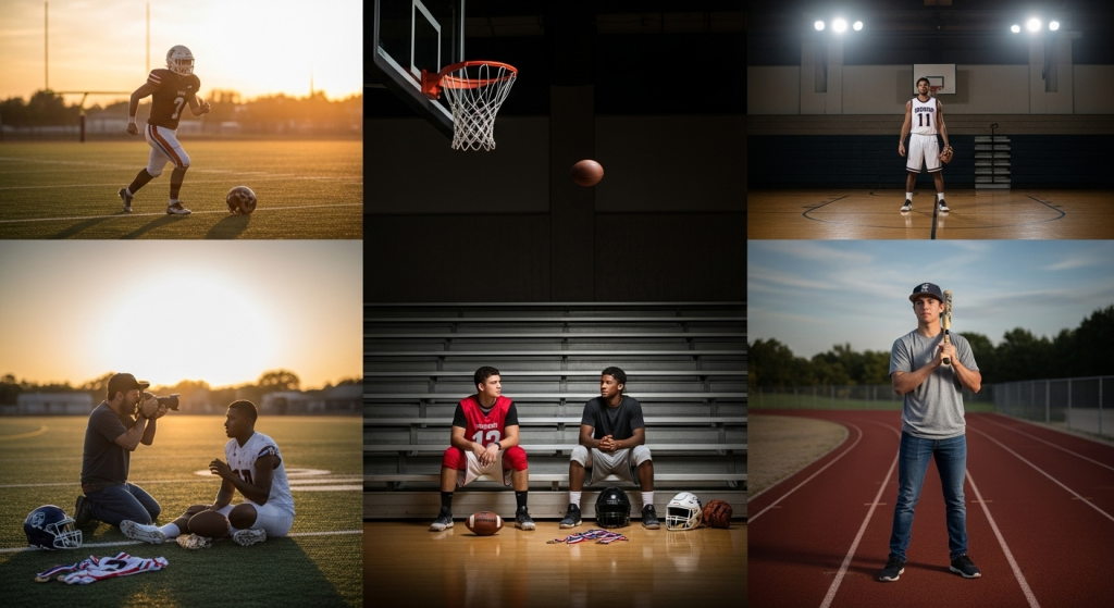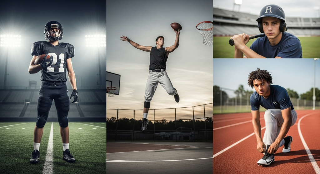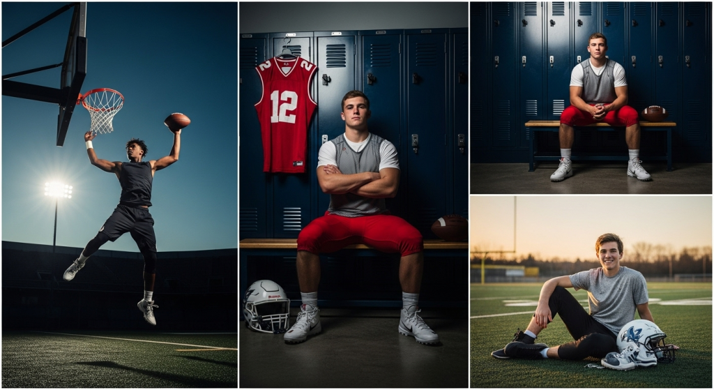Another approach is creating a collage-style session. Different shots can be taken in separate outfits one on the football field, one on the basketball court, another on the track and later combined into a single layout. This not only gives variety but also allows each sport to stand out individually.