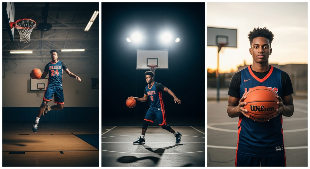 Props like basketball shoes, customized jerseys, or even a favorite team’s gear can add a personal twist to the shoot. The key is blending athletic action with individuality, so the final portraits reflect both the love for the game and the personality of the senior.