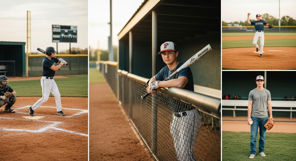 The setting plays a big role in baseball portraits. Photos taken in the dugout, near the scoreboard, or on a dirt infield add authenticity and emotion. Many seniors also like to include personal details such as a well-worn glove, favorite bat, or team hat to make the pictures more meaningful.
